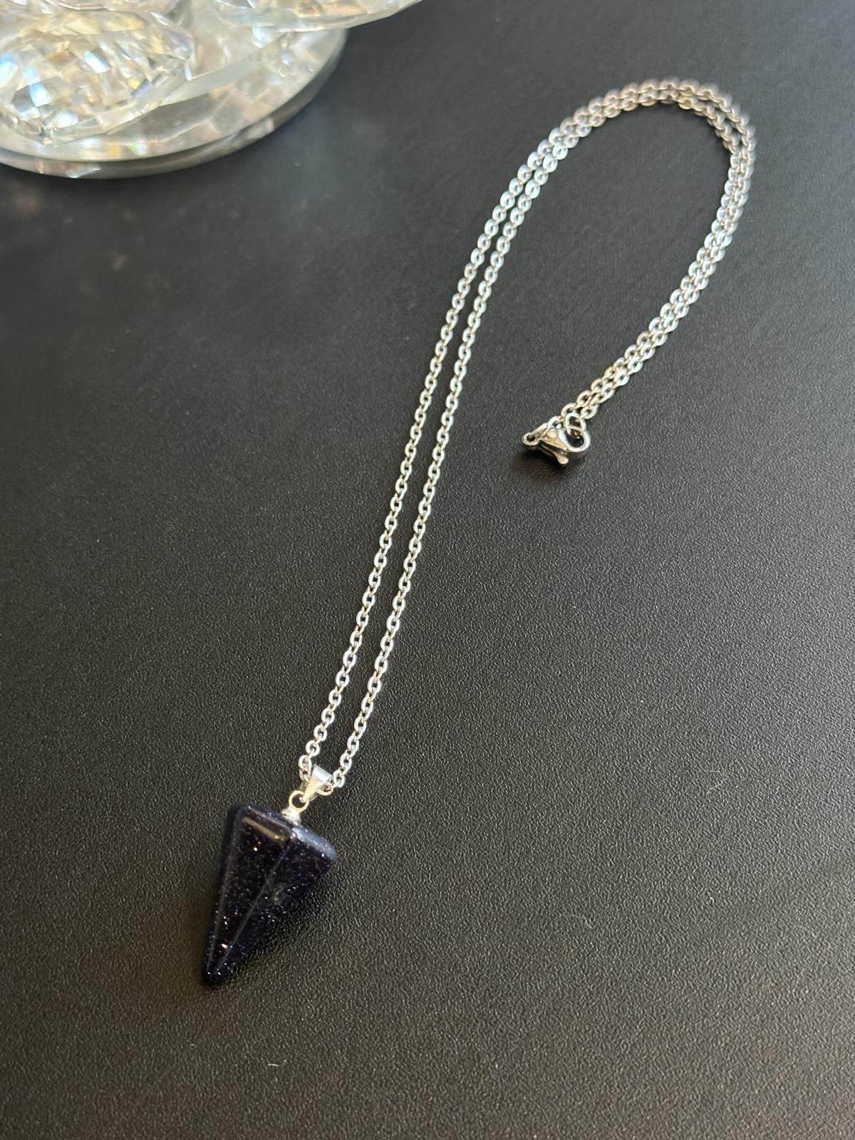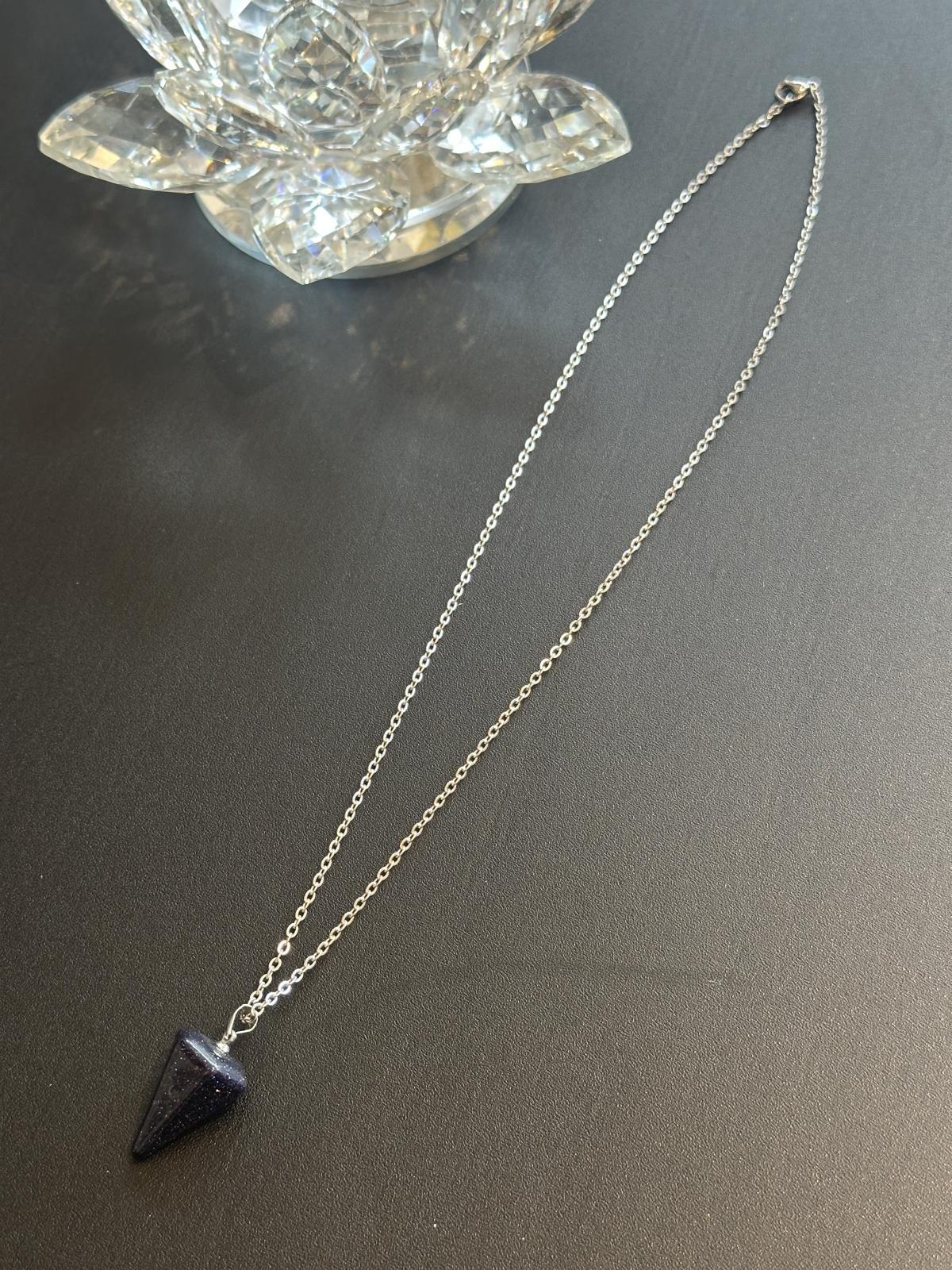 このペンデュラムの石は ブルーゴールドストーン (Blue Gold Stone) 細かなキラキラがロマンティックな イタリア発祥の美しいブルーゴールドストーン 持つ人の意思を強く保ち、 自分自身を肯定して 精神を安定させ、 自信を与えてくれるといわれる石 何があっても平常心で 物事を受け止められるようになるといわれます 自信を保ち、平常心を失わない 安定感を与えてくれるこの石は 人やものとの出会いなどの 様々なチャンスを与えてくれるとされる まるで夜空の様な輝きは 見ているだけでパワーが沸いてくるようで 疲労を取り除いてくれるともいわれます  天然石の力をも 持ち合わせたペンデュラムを お守りとして持つだけでも あなたに力を与えてくれます 迷いがあれば ぜひこのペンデュラムで 答えを導きだして もらいましょう!
