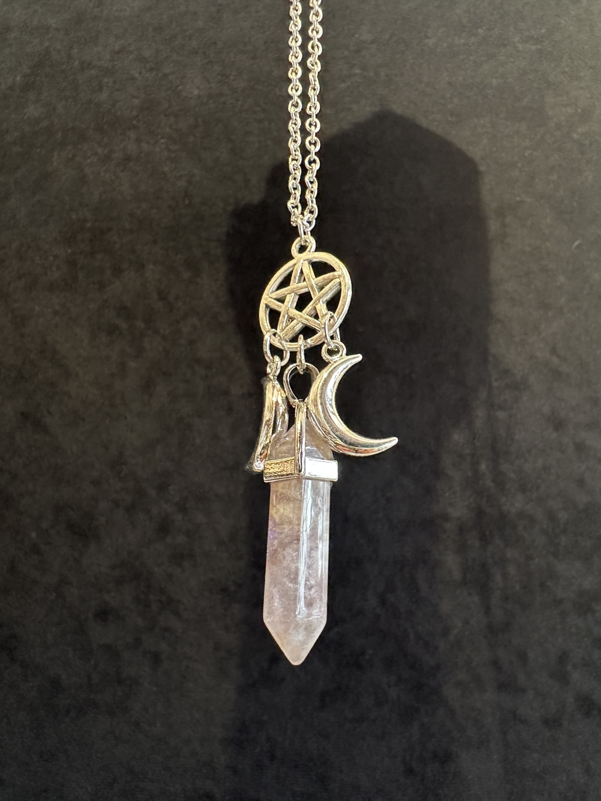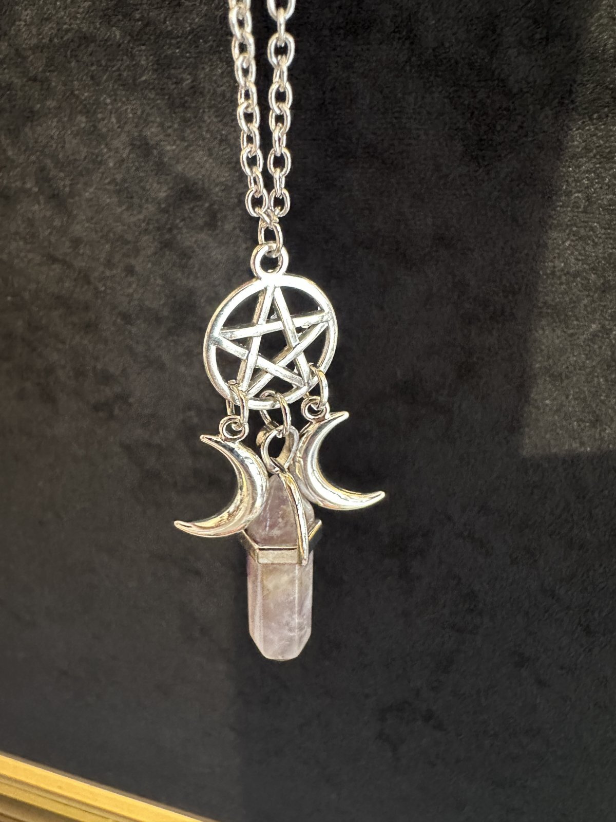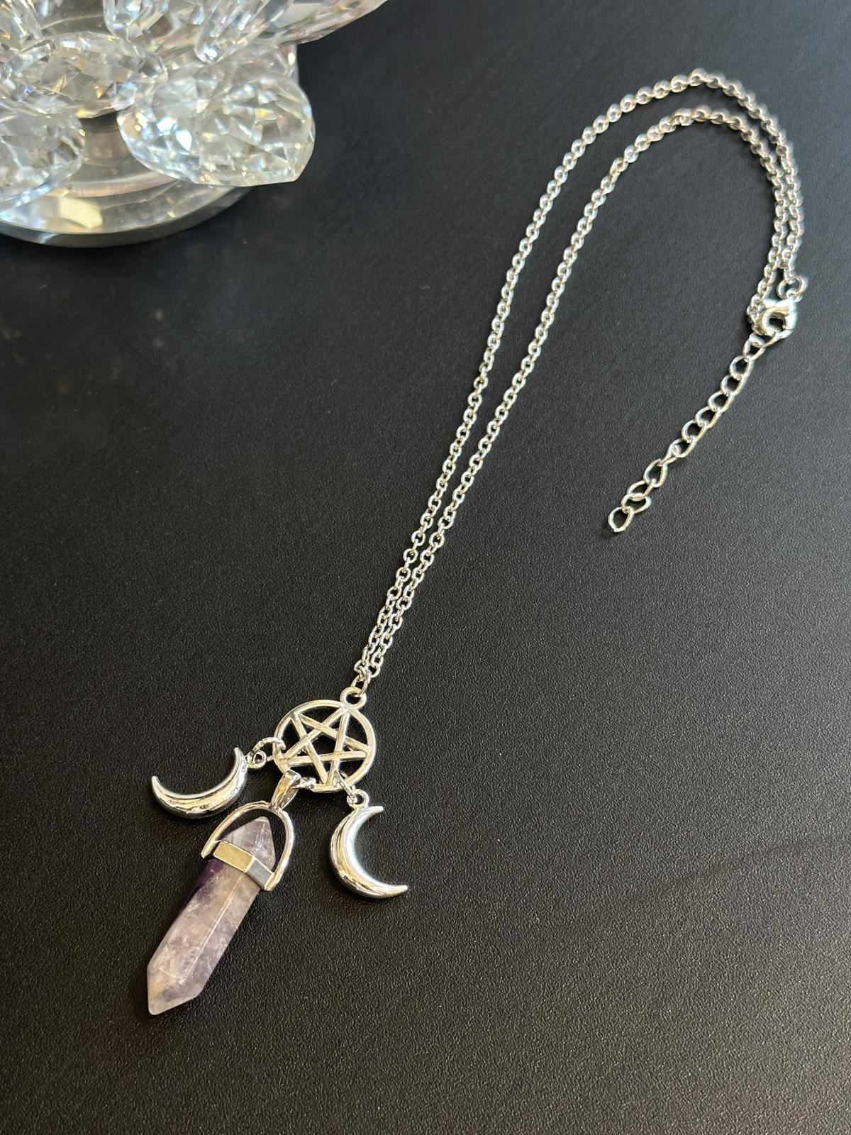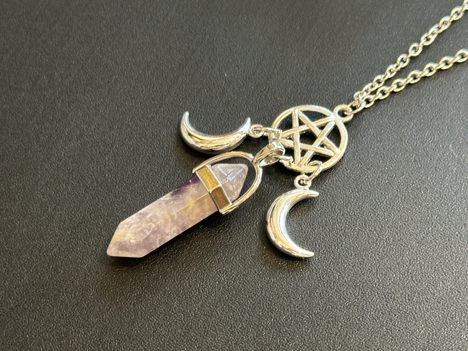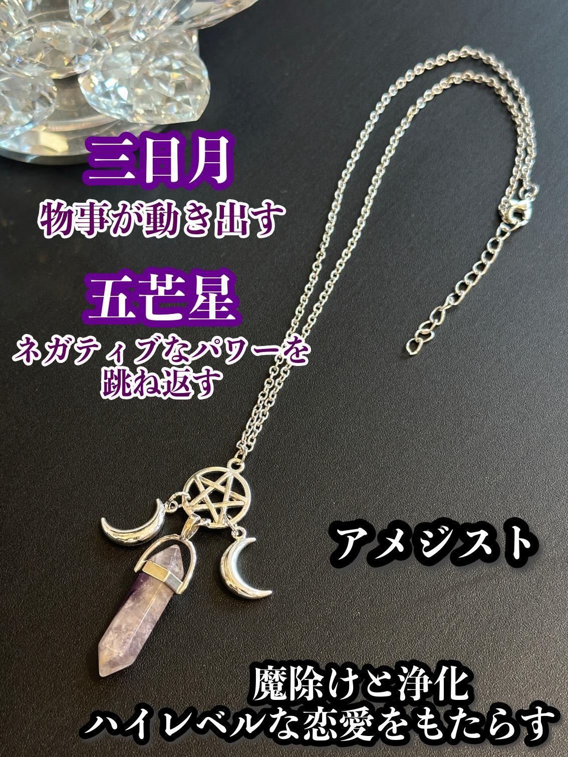 ペンデュラム ネックレス ペンデュラムとは 願いを叶える力を持つ三日月と 厄除け・魔除けの絶大なパワーを持つ五芒星 魔除けとハイレベルな恋愛をもたらすアメジストが ひとつになった おしゃれなペンデュラム。